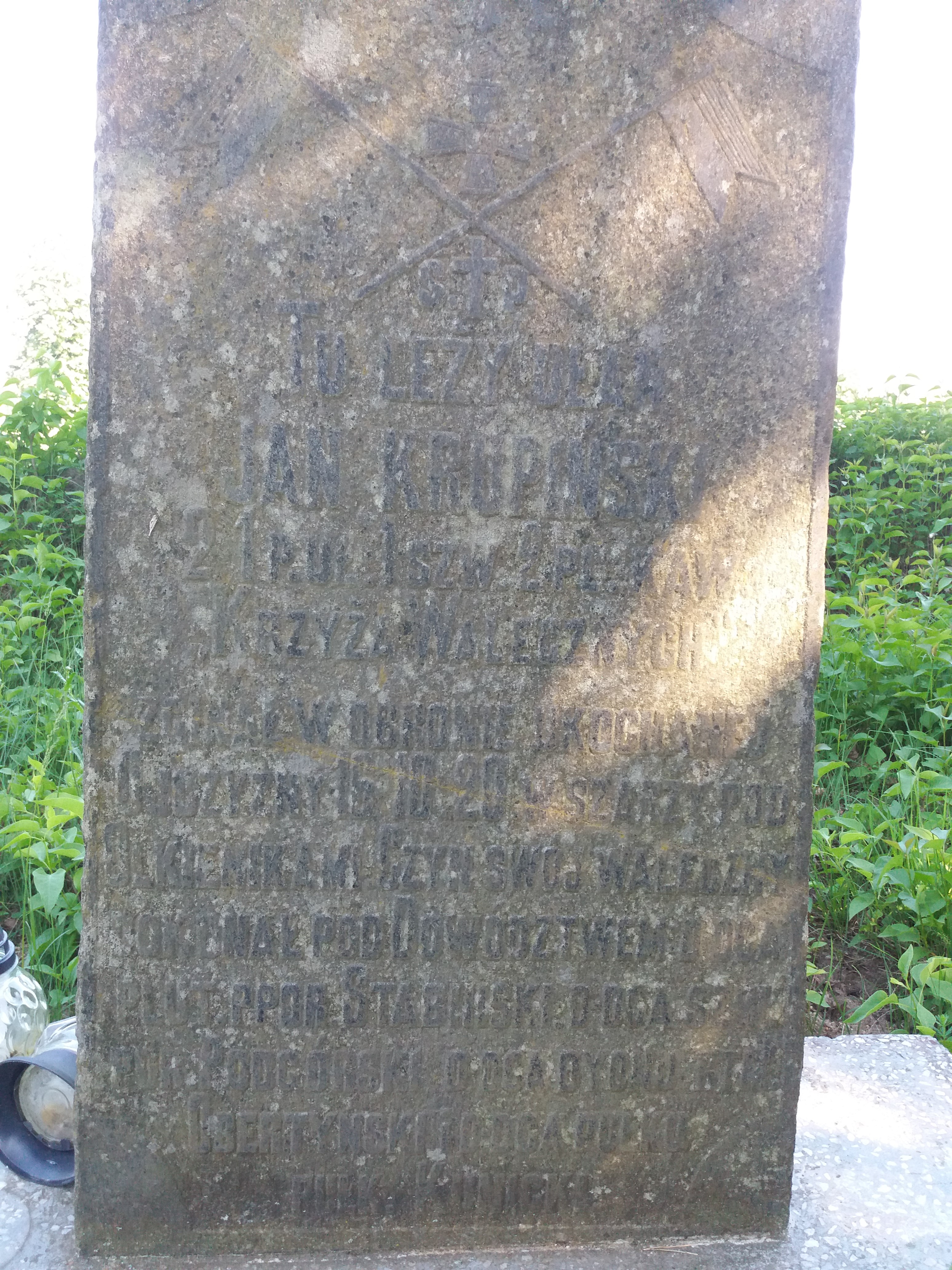 Krupiński Jan: Tu leży 21 p. uł., 1 szw., 2 pl., kaw. Krzyża Walecznych. Zginął w obronie ukochanej Ojczyzny 16.X.1920 w szarży pod Olkienikami. Czyn swój waleczny dokonał pod dowództwem: d-dca plut. ppor. Stabiński, d-dca szw. por. Podgórski, d-dca dyonu rtm. Obertyński, d-dca pułku pułk. Kunicki.
